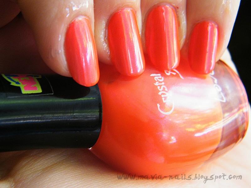 Muszę zacząć od tego, że lakier mnie nie zachwycił. Kolor ma ładny, pięknie się prezentuje ale jakoś nie przekonał mnie do siebie, po trzech warstwach nadal widziałam trochę końcówkę paznokcia. Bazą jest liliowy fiolet, zdecydowanie zwrócony w stronę różu. W bazie zatopione są niebieskie drobinki, które tutaj są dla mnie zdecydowanym plusem ponieważ brakuje takich połączeń lakierowych w sklepach. Mimo, że drobinki nie rzucają się w oczy to fajnie prezentuje się jako całokształt. Lubię na niego patrzeć, ale zdecydowanie jak ma coś "na sobie" glitter czy pękacz, za niedługo pokażę Wam go w takim właśnie wydaniu :). Schnie dosyć długo, ale to pewnie ze względu na nałożenie trzech warstw. Dostępność w moim mieście jest fatalna, znalazłam je tylko w jednej drogerii w Krakowie (swoją drogą jak wiecie gdzie znaleźć lakiery Virtual w Krk to dajcie koniecznie znać!;)), na miasteczku studenckim agh w drogerii Magdalena. Kusi mnie jeszcze róż i błękit z tej kolekcji