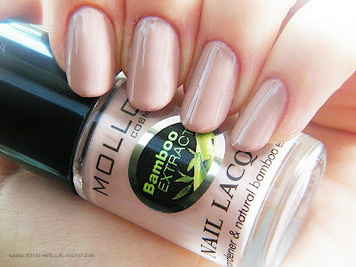 Dziś przeglądałam moją bazę lakierową i aż się przeraziłam ile uzbierało mi się zdjęć do notek! Muszę nadrabiać zaległości, ostatnio pokazuję Wam same nowości a stare swatche zalegają na dysku. Tym razem również pokażę Wam nowość, którą dostałam do przetestowania dzięki uprzejmości drogerii internetowej AlleDrogeria. Lakier z ekstraktem z bambusa świetnie się nakłada. Uwielbiam to w tych lakierach, bo oprócz tego mają super rzadką konsystencję, na szczęście lakier nie rozlewa się po skórkach. Do pełnego krycia potrzebowałam dwóch warstw, choć na szybko wystarczyłaby także jedna;). Schnie bardzo szybko, przez trzy dni nie starł się nawet z końcówek, nie widziałam także żadnych odprysków. Trzymał się w świetnym stanie jednak zmyłam go ponieważ kolejne czekają w kolejce;p. Kolor jest świetny, można by powiedzieć, że nudziak idealny. Jestem blada, na moich dłoniach wygląda bardzo naturalnie, nie jest za żółty, ani za szary czy za różowy. Świetnie komponuje się ze skórą dłoni, wygląda bardzo elegancko. Jedyne do czego mogę się przyczepić to dostępność... W Krakowie znam niewiele miejsc (spotkałam je jedynie w jednej, malutkiej drogerii i to w cenie koło 13 zł) gdzie można kupić lakiery Mollon - a wielka szkoda... Ogromna pojemność za niewielką cenę. To lubię:). Aktualnie na www.alledrogeria.pl jest promocja na lakiery z serii bambusowej - 7,5zł / 12ml. Polecam:)